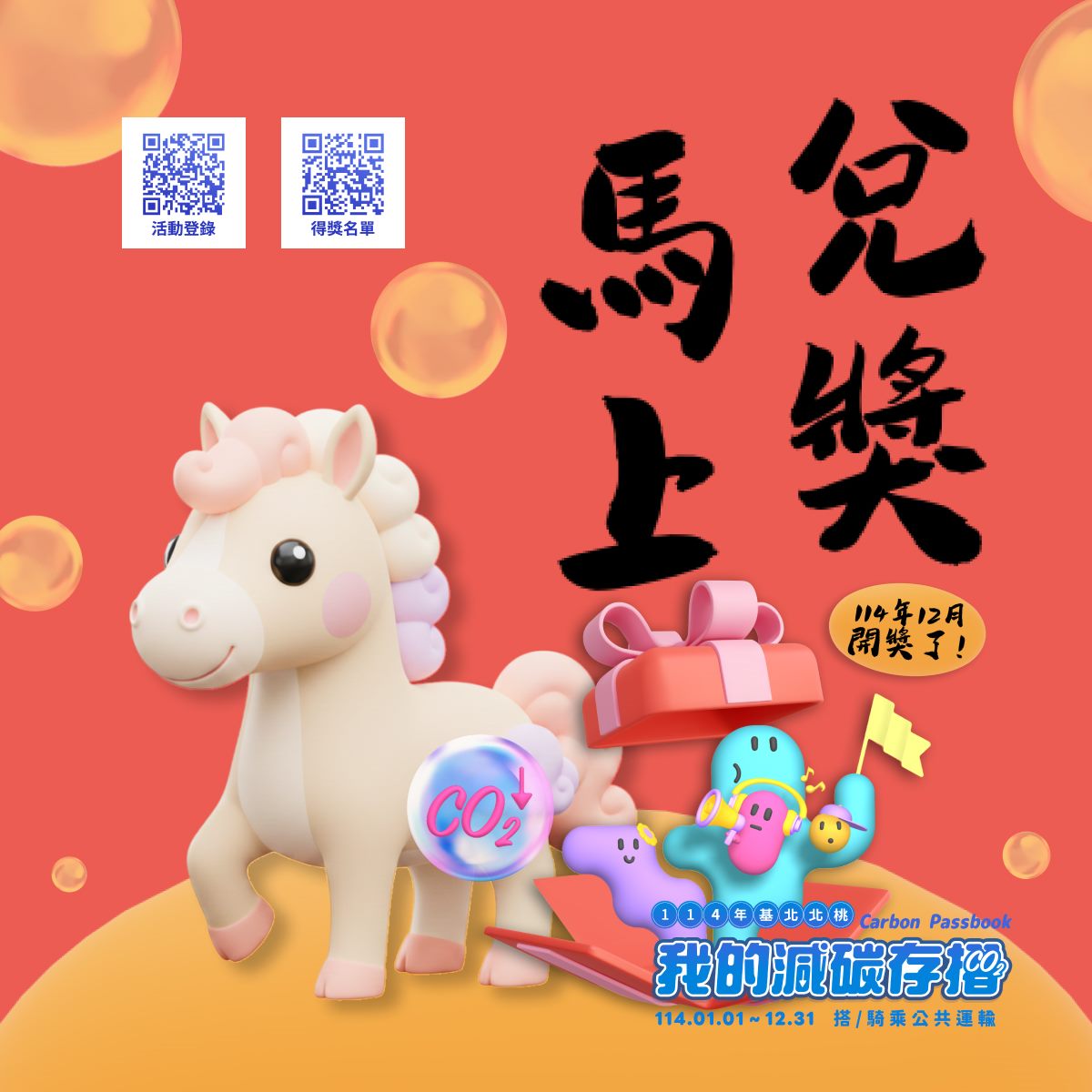 基北北桃「我的減碳存摺」全民運動114年12月份「月月抽」及「月月兌」得獎名單於26日公布!恭喜各位得獎者,得獎名單請詳活動網站([連結] )。幸運中獎的得獎者,悠遊卡公司將於1月31日前以簡訊通知;月月兌部分獎項 (如:專用垃圾袋、美式咖啡、霜淇淋等)將以悠遊付APP訊息推播方式通知領取,請得獎者留意手機APP推播訊息;其餘獎項將依序通知及進行寄送作業,也請耐心等候!